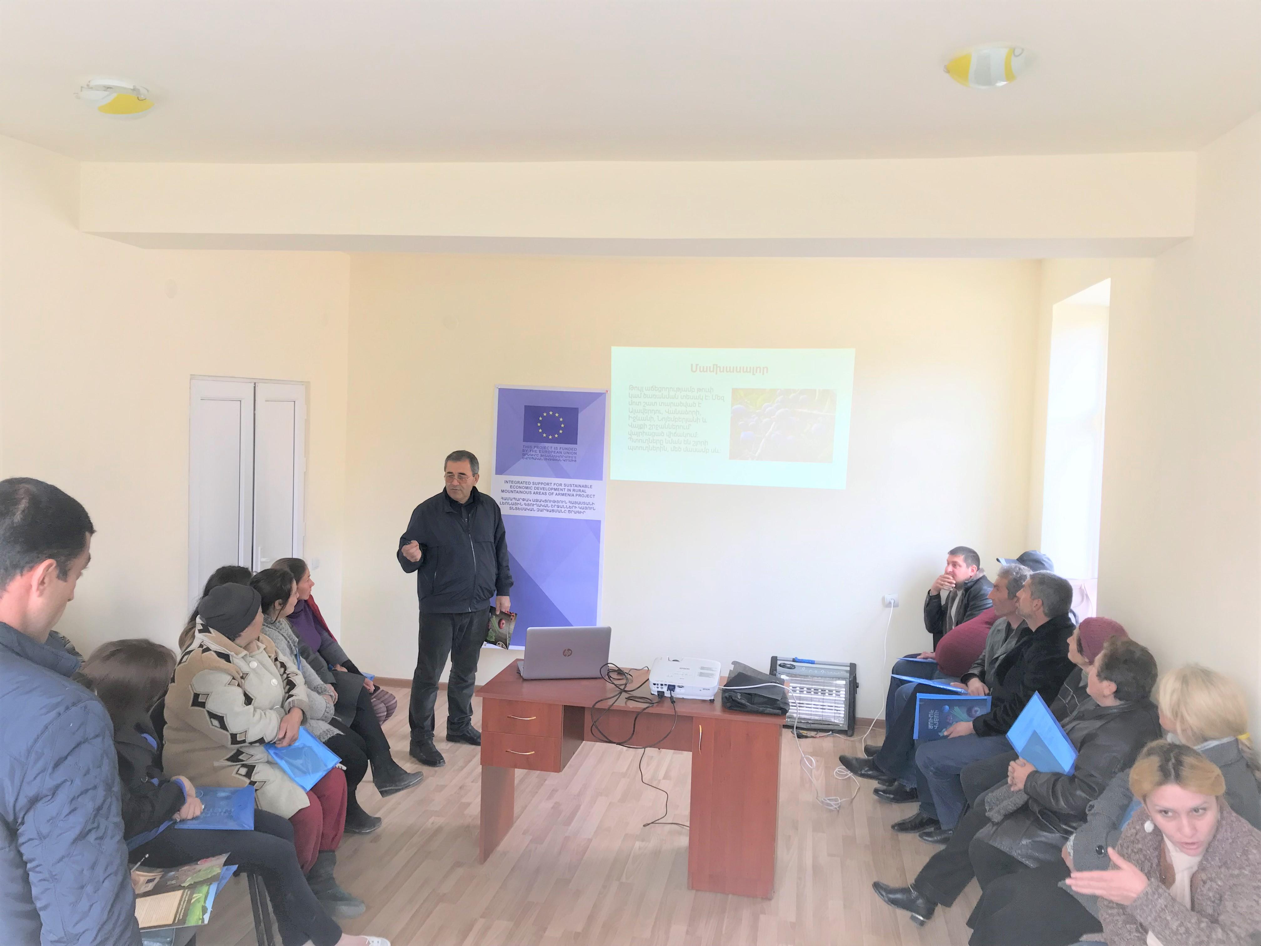 On 16.03.2018, within the framework of the "Integrated Support for Sustainable Economic Development in Rural Mountainous Areas of Armenia" project, a training/seminar on "Brief Description of 10 Most Common Plants for Wild Collection" was held in Areguni Community of Vardenis Region of Gegharkunik Region. 23 participants from Geghamasar, Areguni and Pambak communities of Gegharkunik province were present. During the practical training the activities of "Antaram Productional Cooperative" company was also presented, the specific varieties of company’s interest as well as some of the wild harvesting techniques. Participants got acquainted with the "Wild Collection" information manual published by Shen NGO with the support of the European Union, upon which each of them received one copy of the manual.