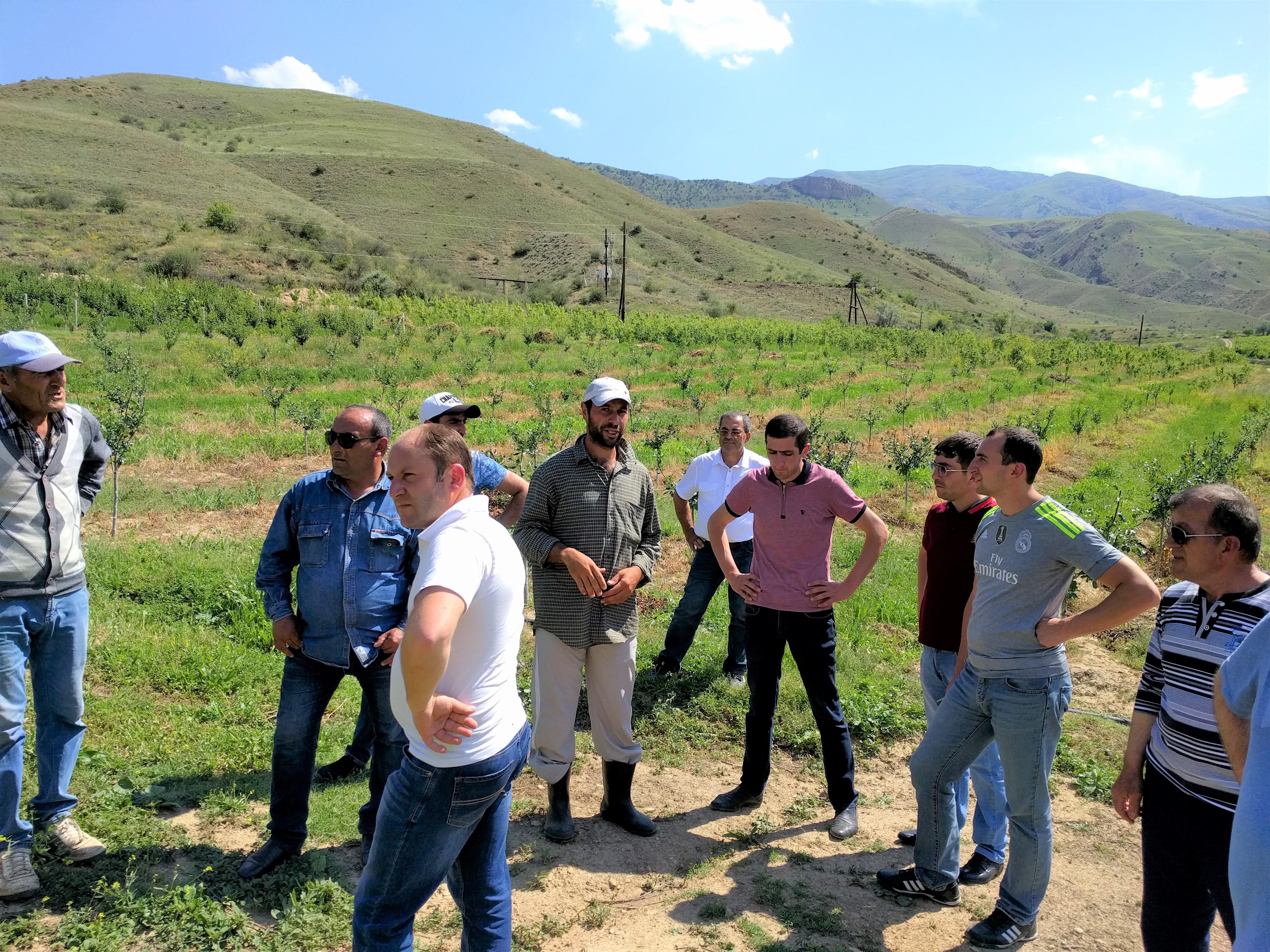 On June 7, a group of beneficiary farmers from Vardenis sub-region visited the dwarf orchard and fruit tree nursery of Syunik-Development NGO in Yeghegnadzor sub-region of Vayots Dzor province. The purpose of this visit was to get acquainted with new dwarf varieties of pear, apple, sweet cherry and alike fruits, their farming techniques as well as anti-hail netting and drip irrigation system used at those orchards. This event attended 11 beneficiary farmers involved in HEKS-EPER funded Horticulture Market Development project.